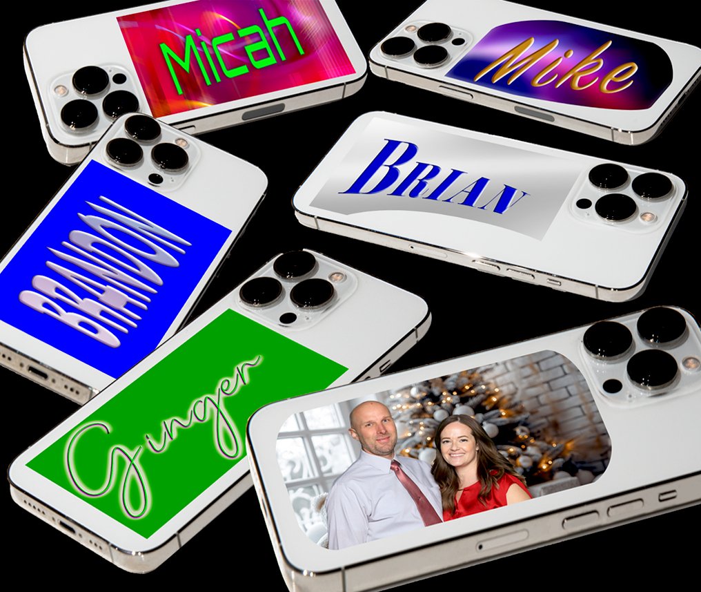 Guests can use their name or favorite word. Several background designs and font options are included. Or they can use a brand new photo taken at our optional photo station.